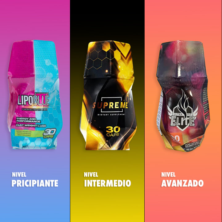 Este trío de quemadores de LIPOBLUE es perfecto para cualquier nivel de experiencia en la pérdida de peso. Empieza con el Quemador para Principiantes, avanza al SUPREME para intermedios y alcanza tus metas con Élite para avanzados. Incluye vitaminas, minerales y extractos naturales para apoyar tu salud general.